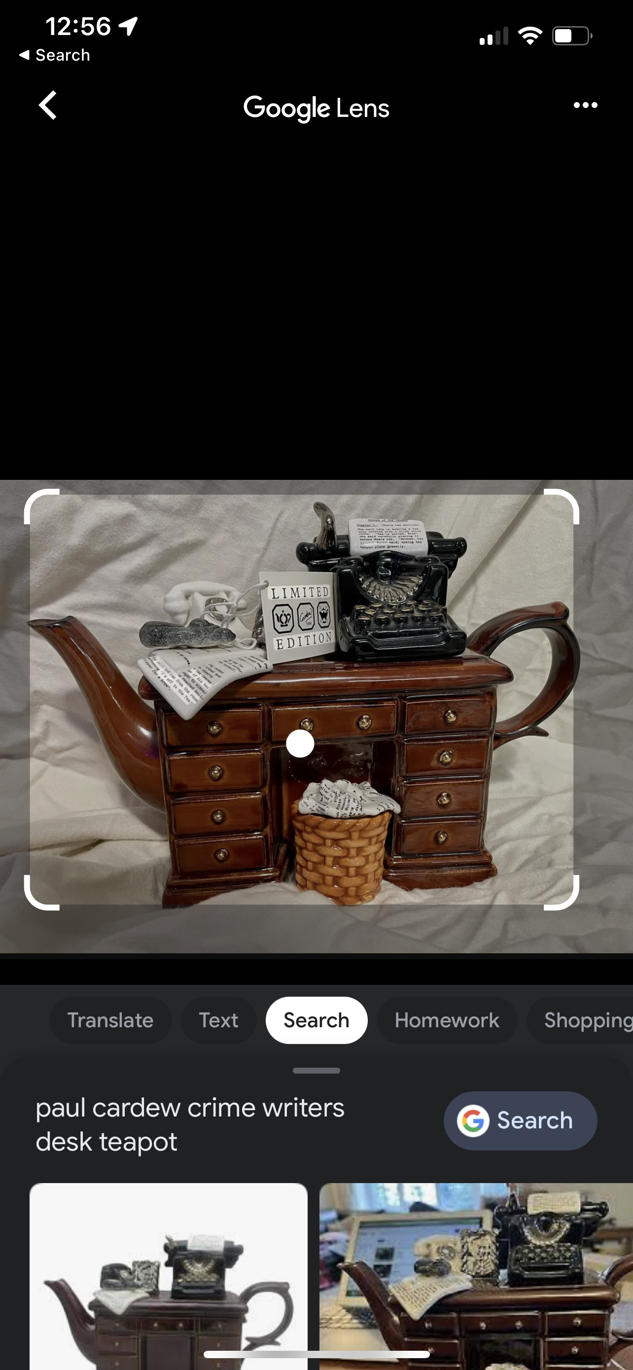 Several hours after the estate sale had started, I walked in and found this teapot sitting on the fireplace mantle. Using keywords and Google Lens, I was able to figure out that this was a limited edition Cardew teapot called The Crime Writer's Desk.