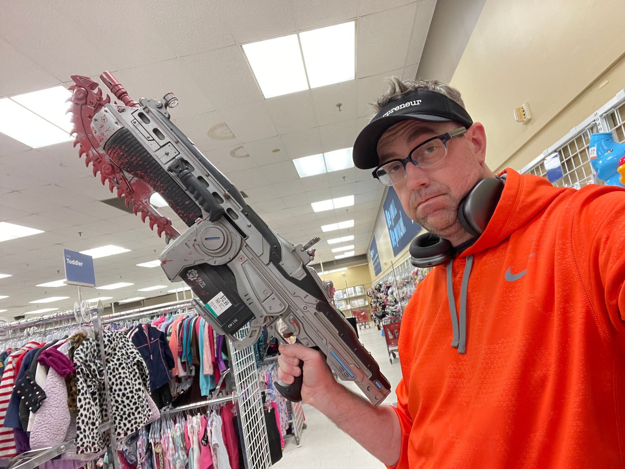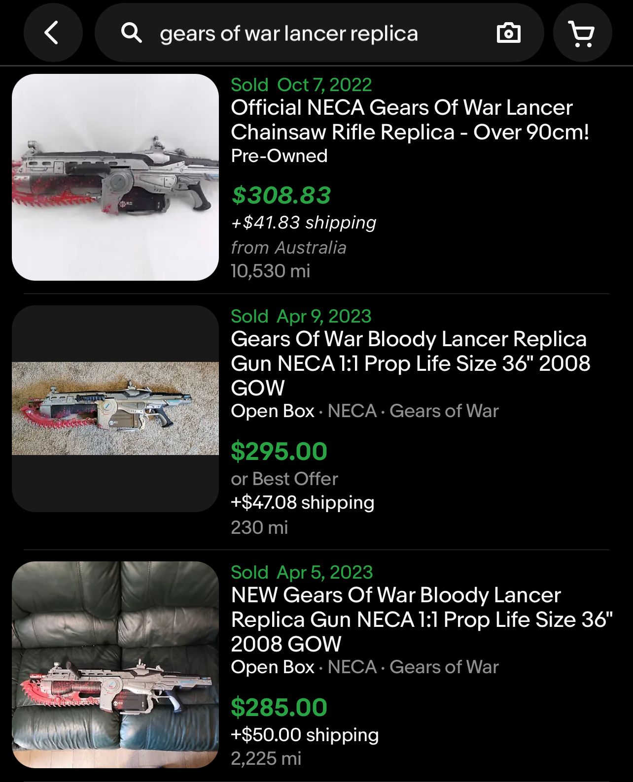 Using Google Lens, I was able to identify it as Gears of War Lancer Replica (bloody version).